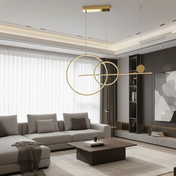 Lampa LED NEW AGE przyciąga wzrok swoją unikalną formą - przenikające się koła LED i pozioma listwa tworzą efekt lekkiej, harmonijnej geometrii. Asymetryczne złote koło dodaje lampie charakteru i wprowadza do wnętrza subtelny akcent nowoczesnej elegancji.