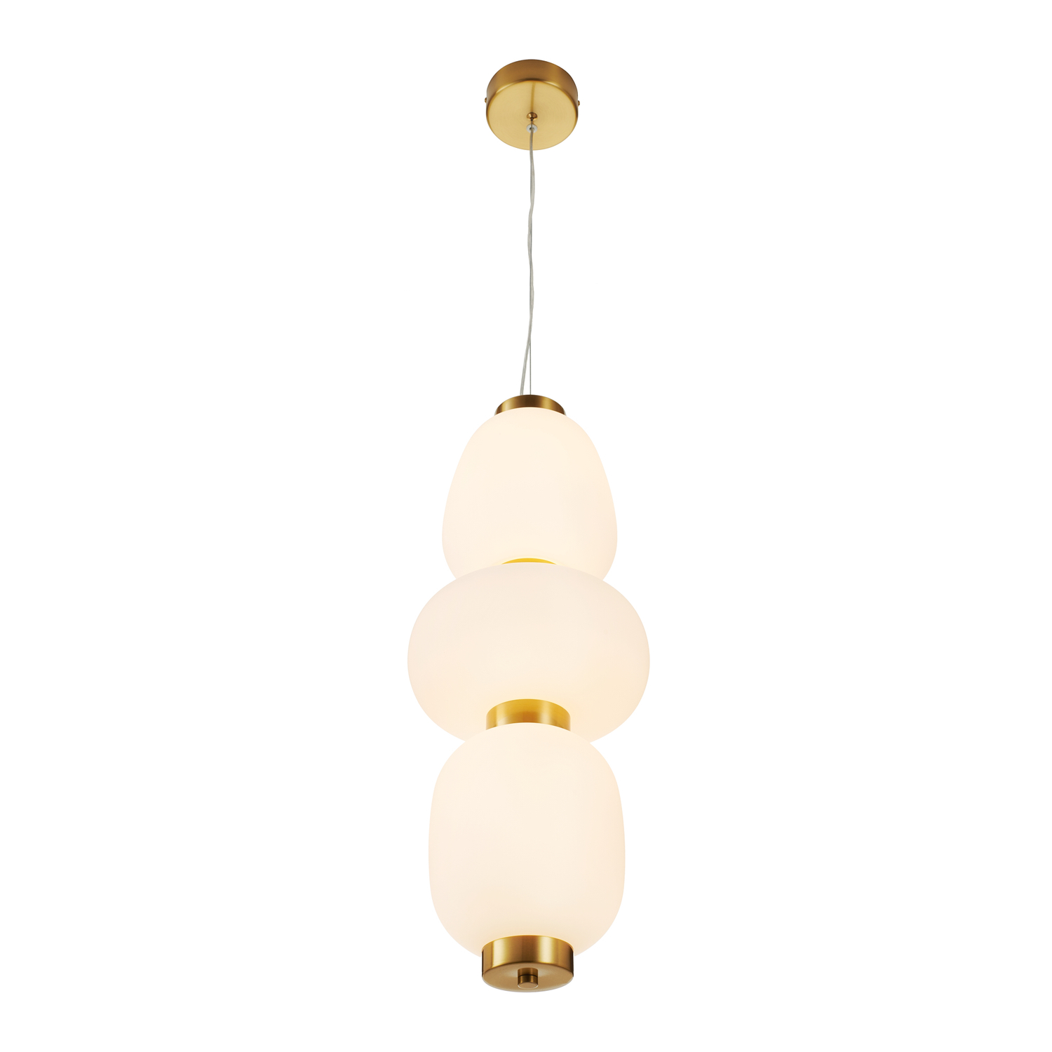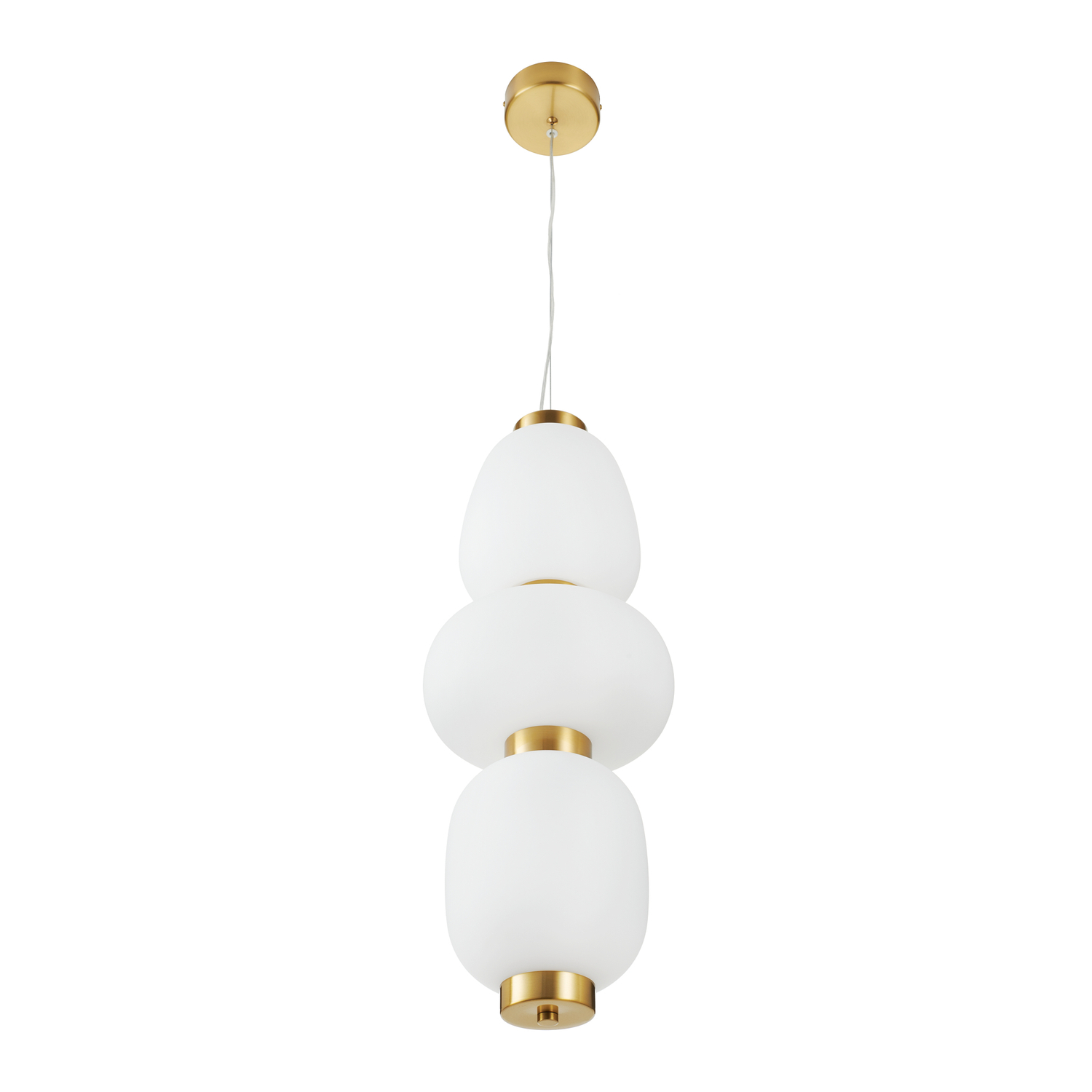 Klosze wykonane są z białego szkła, a metalowe akcenty w kolorze złotym nadają lampie wyjątkowego charakteru.