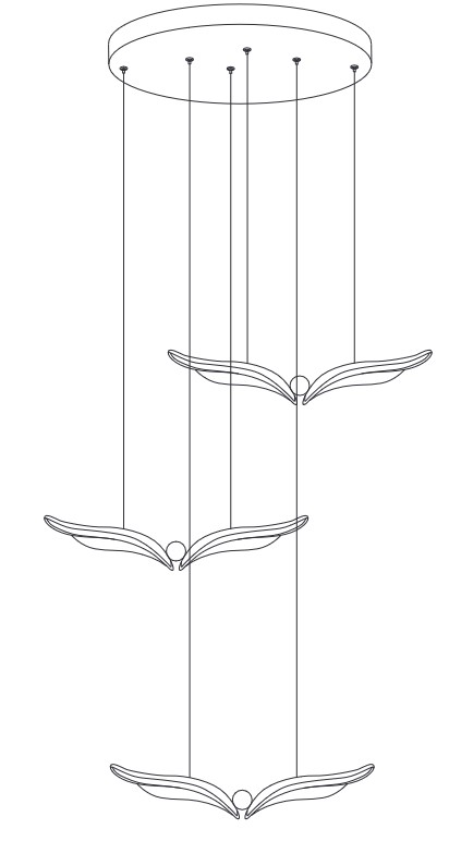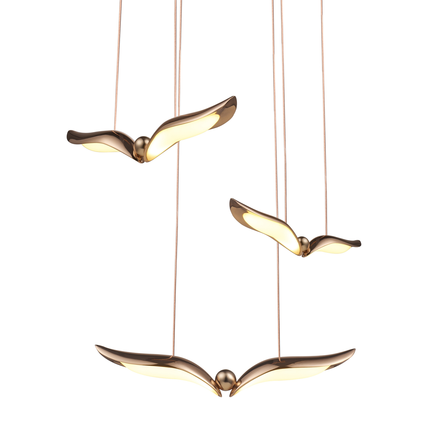 Każdy ptak zawieszony jest na złotych linkach o różnych długościach, przymocowanych do minimalistycznej, okrągłej podsufitki, co daje lekkość formy i trójwymiarowy efekt.