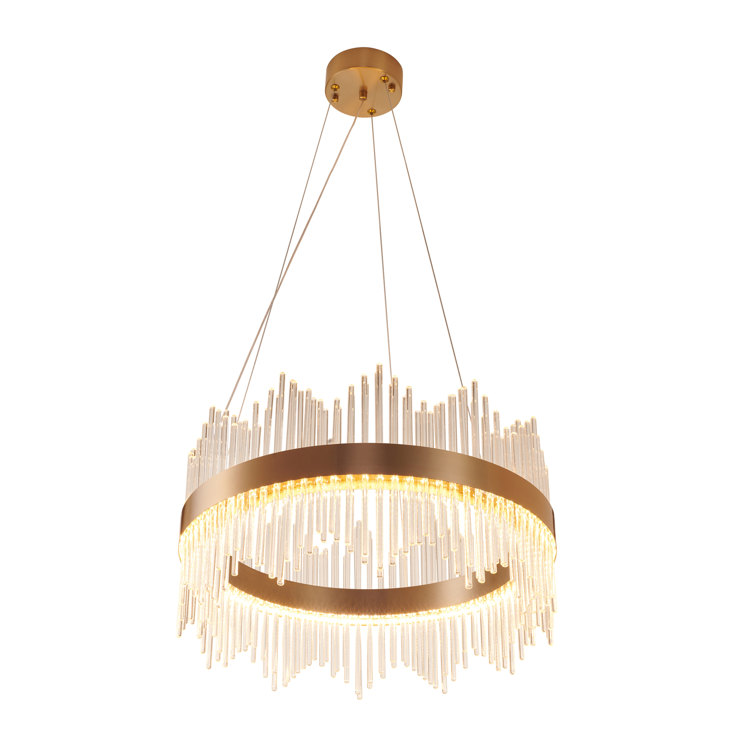 Kaskada kryształowego światła: Centralnym elementem lampy jest szeroki, okrągły pierścień wykonany z błyszczącego, złotego metalu.