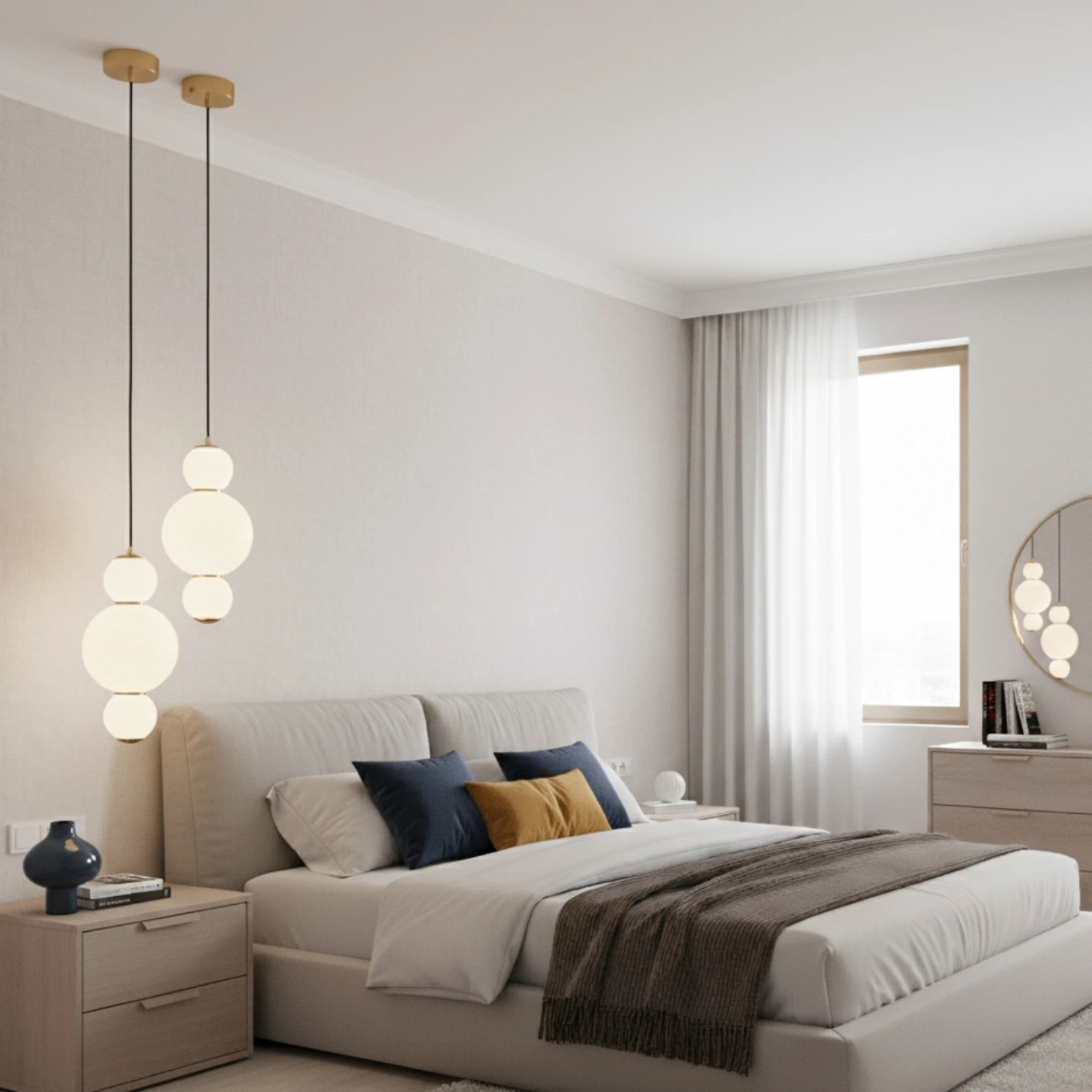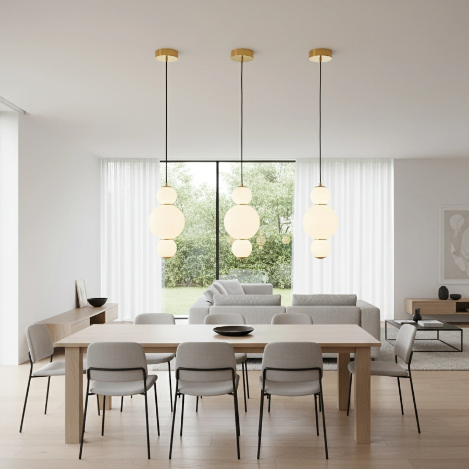 - Lampa wisząca Bombina - nowoczesna elegancja. Trzy białe kule, złota rozeta i czarny przewód. Idealna do salonu, jadalni i sypialni.