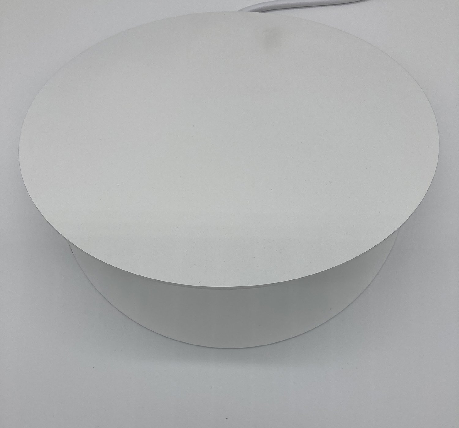 Wykonana z metalu w eleganckim białym kolorze, wyróżnia się płaskim, okrągłym kloszem, który subtelnie rozprasza światło, tworząc przyjemny klimat w pomieszczeniu.