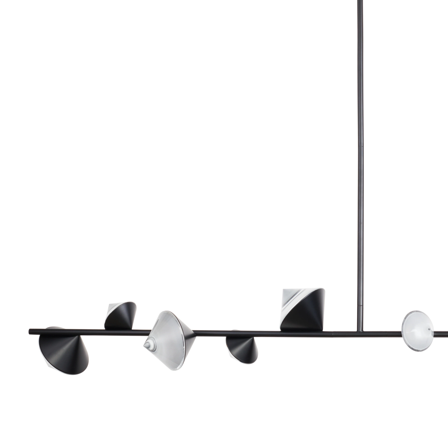 Jej charakterystyczna pozioma listwa z kloszami w kształcie stożków tworzy efektowną kompozycję świetlną, która przyciąga wzrok i nadaje wnętrzu wyjątkowego charakteru.