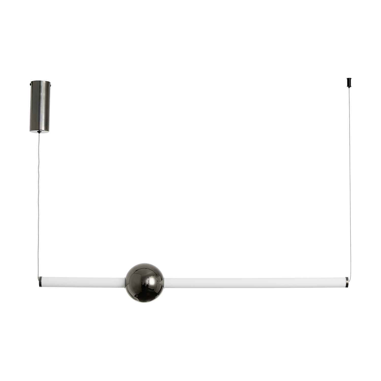 - Biała lampa wisząca ledowa o horyzontalnym kształcie zwieńczonym czarną metalową kulą.